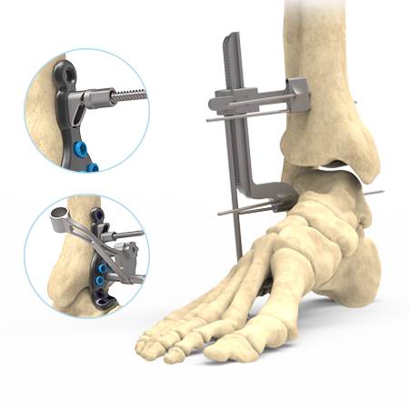 The Stratum Ankle Fusion Plating System offers an anterior, lateral and posterior plating platform, fit to anatomical scans, providing the surgeon with multiple options for anatomical plate application for joint arthrodesis. This system utilizes a joint distractor device designed to provide optimal visualization for joint preparation and patented compression ramps that can achieve up to 7.0mm of linear, bi-cortical compression of the TT & TTC joints. Each plate features an optional outrigger device for guiding a 6.0mm cannulated crossing screw if additional stabilization is desired.