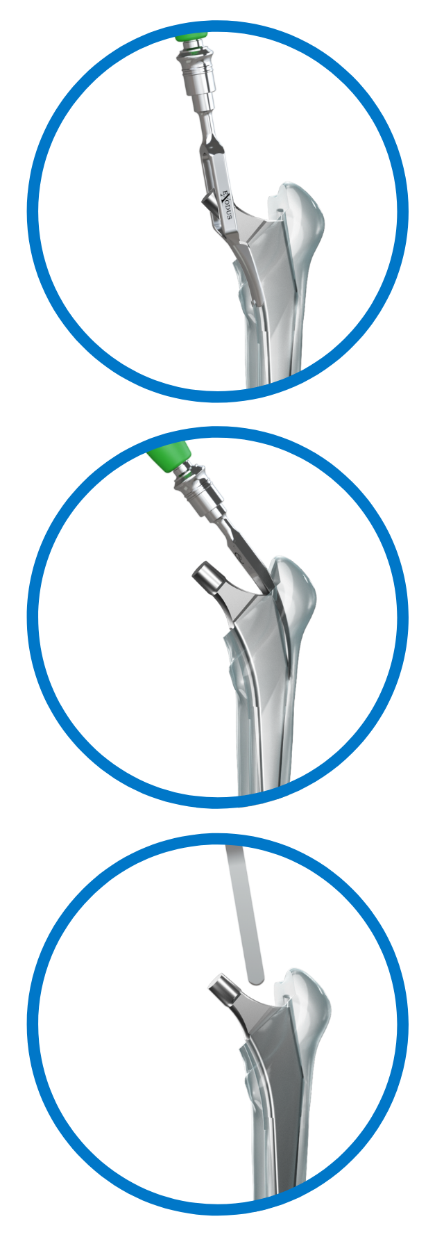 The Exodus Revision Hip System facilitates stem bone interface disruption that is significantly improved over traditional techniques and is designed for minimal bone loss with minimal effort and minimal damage to the proximal femur, compared to an extended trochanteric osteotomy.
