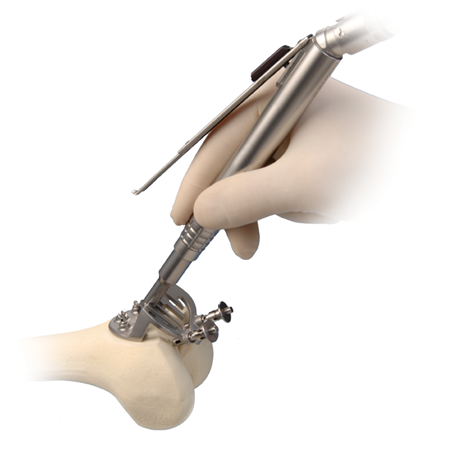 A simple instrument, eliminating challenges and errors presented in freehand techniques.5 By referencing native cartilage to determine varus/ valgus placement, the intercondylar region of the implant is flush with surrounding cartilage to help avoid impingement of the patellar component.